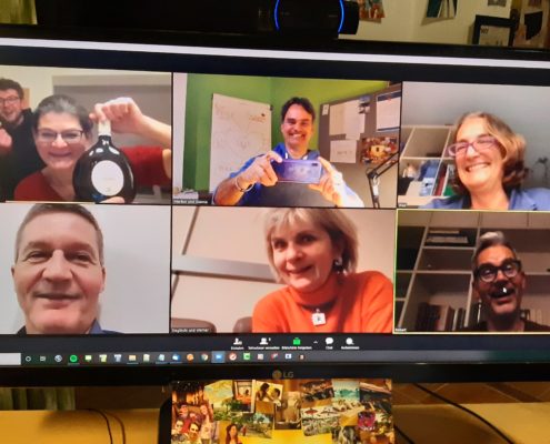 - sind wir in direktem persönlichen Kontakt indem wir uns einmal pro Woche live per Zoom-Call treffen. Im Call sind außer Dir noch maximal 11 weitere Kursteilnehmer.